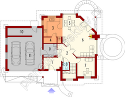 Выразительность почти сказочного с точки зрения оформления экстерьера дома в стиле кантри, построенного из блоков, кроется в целом ряде декоративных элементов. Благодаря оригинальной конструкции, декорированной кирпичными колоннами и оригинальной формы окном, создается красивый экстерьер, который нельзя не заметить. Оригинальность внешнему виду придает сочетание оштукатуренных поверхностей и участков, облицованных кирпичом. На террасе будет расположен камин, труба которого оформлена с помощью кирпича.