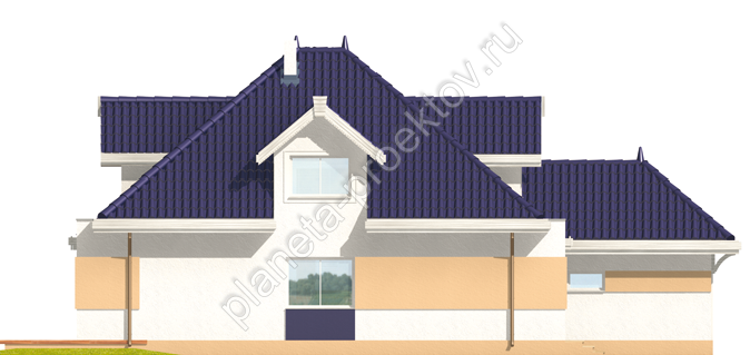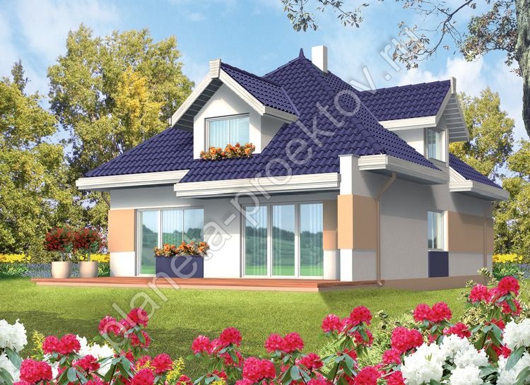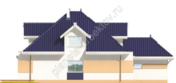 С тыльной стороны коттеджа располагается галерея-терраса, на которую можно выйти из гостевой зоны и кабинета. Благодаря тому, что коттедж имеет горизонтальную направленность, есть возможность для удачного планирования интерьера. К гостиной примыкает кухня, отделенная дверями-купе. Вторая группа помещений на этаже – это кабинет, санузел, кладовая, а также гараж. Три комнаты в сочетании с ванной образуют мансарду, отведенную под зону отдыха. Такой же яркий с точки зрения оформления экстерьера можно построить по проектам домов из дерева.