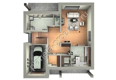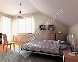 Первый этаж, согласно проекту дома из газосиликатных блоков, отводится гостевой зоне, которая состоит из гостиной-столовой и кухни. Кроме этой зона здесь планируется обустройство просторной ванной комнаты и санузла. Просторы мансардного этажа отданы под четыре спальни, расположенные вокруг еще одной ванной комнаты. При этом две комнаты выходят на балкон. Особая выразительность и цельность коттеджа достигается за счет широкой и низкой двускатной крыши, под которой располагаются и балконы, и гараж.