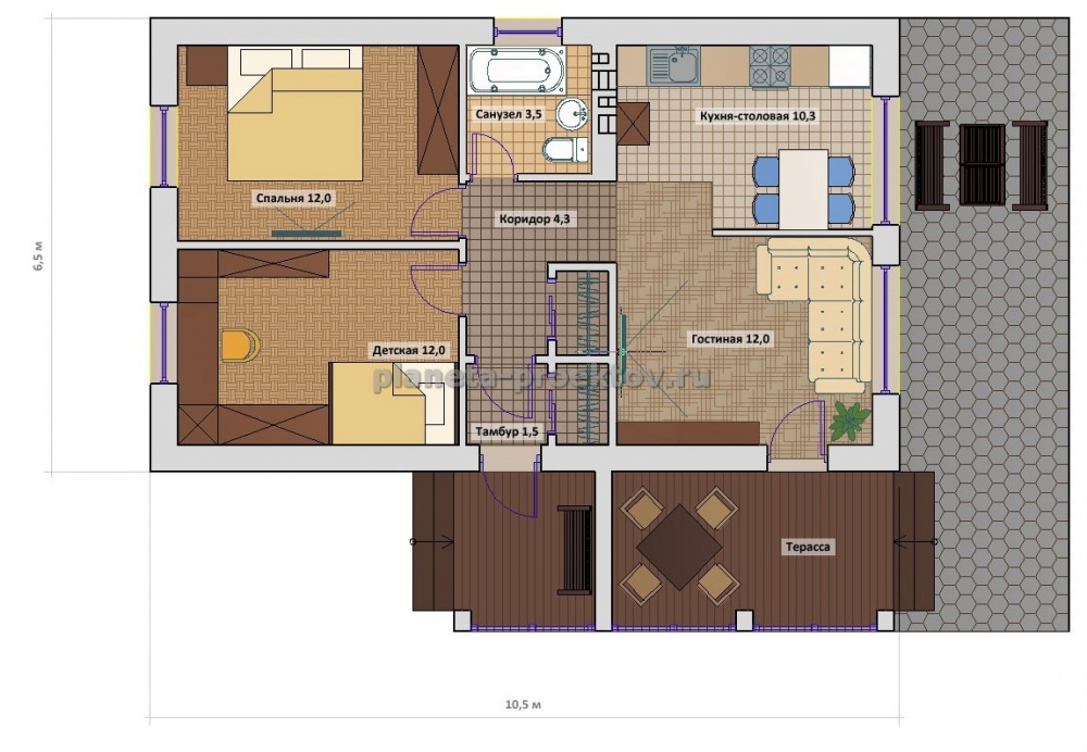 Пространственная организация строилась с учетом того, что все помещения -жилые и бытовые - располагаются на одном этаже. Именно поэтому проектировщики исходили из принципов практичности и функциональности его организации. Данный коттедж будет уместен в качестве дачи, при этом не менее уютные строения можно возвести по проектам домов из дерева. Планировочное решение предполагает разделение пространства этажа холлом на две части: одну будут занимать гостиная и кухня, а вторую – спальня и детская (вместо нее можно обустроить еще одну спальню). Завершается план оформлением ванной комнаты.