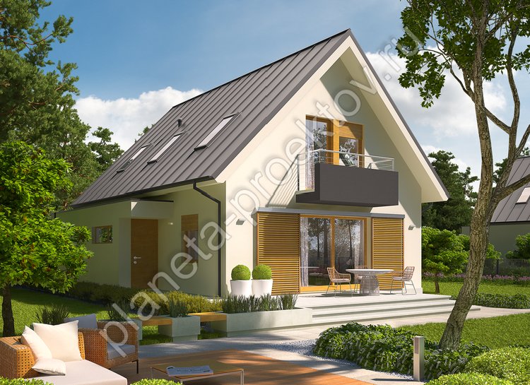 Эти проекты домов с мансардой характеризуются лаконичностью внешнего облика и эффективностью внутренней планировки. Главная цель строений в европейском стиле – максимальная близость к природе, именно поэтому преобладают одноэтажные дома с мансардами. Очарование этому строению придают раздвижные стеклянные двери, ведущие в просторную гостиную. Второй вход в дом располагается с задней половины строения, а в гараж ведет вход со стороны главного фасада.