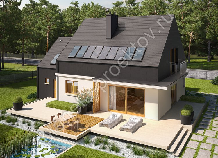Планировка проста и логично: первый этаж, представляющий собой гостевую зону, состоит из гостиной, где запланирована обеденная зона, кухни, кабинета, а также санузла и техпомещения, выводящего в гараж. Мансарда – это три комнаты, оснащенные мансардными окнами и выходящие на балкон. На этом же ярусе по плану будет оборудована ванная с санузлом. Особенную внешнюю привлекательность готовому проекту коттеджа придает балкон-эркер прямоугольной формы.