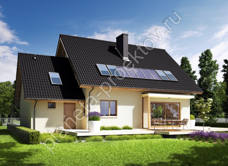 Готовые проекты коттеджей в европейском стиле из кирпича отличает лаконичность и одновременно выразительность внешнего облика. Лаконичность складывается из отсутствия декоративных украшений и простоты конструкции, которая представляет собой гараж и жилое пространство, возведенные под самостоятельные кровли. Выразительность достигается за счет большого количества стеклянных поверхностей. Гостиная оснащена двумя парами раздвижных дверей, большое количество мансардных окон способствуют естественному освещению помещений. Единственным архитектурным украшением является балкон.