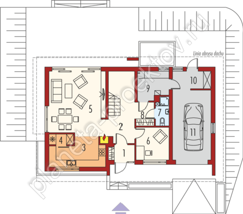 Готовые проекты домов в стиле модерн выглядят стильно и современно. Большое количество окон – обычных и мансардных, а также стеклянные поверхности раздвижных дверей делают это строение выразительным и живым. Оригинальность внешнего облика достигается за счет таких элементов, как балкон и прямоугольный эркер с широким окном, который украшает холл. Вытянутая форма позволяет разместить строение даже на узком участке. Украшением коттеджа служит просторная угловая терраса-галерея.