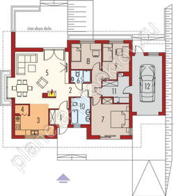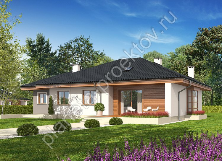 Рациональным объемно-планировочным решением является распределение помещений внутри строения, который условно делится на две половины. Первую занимает гостиная, в которой оборудуется камин. В этой же комнате располагается обеденная зона, ведущая в кухню. Вторую часть пространства занимают три комнаты под спальни, санузел и ванная, а также бытовое помещение, ведущее в гараж.