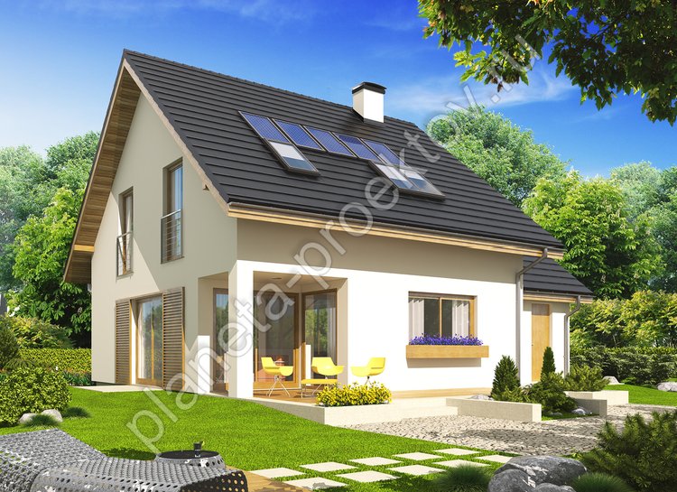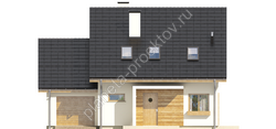Данный проект коттеджа, выполненного в европейском стиле, предлагает возведение комфортабельного и просторного дома, который органично впишется в ландшафт загородного участка. Привлекательность внешнего облика создается за счет удачного решения, воплощенного в обустройстве входной группы. Она представляет собой нишу с колоннами, в которой располагается раздвижная дверь, ведущая в гостиную. Важным функциональным решением является пристройка к основному зданию гаража, в который можно попасть как из дома, так и с улицы. Возведенный под отдельную крышу, он выглядит как самостоятельный архитектурный элемент.