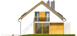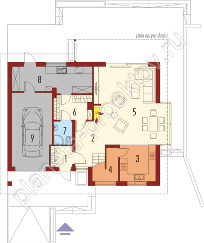 Жилая мансарда позволяет максимально использовать помещения первого этажа, который представляет собой гостевую зону и примыкающие к ней бытовые помещения в виде кухни и тамбура, ведущего в гараж. Эркер удачно подходит для обустройства в нем обеденной зоны. На мансарде запланированы четыре комнаты, санузел и ванная. Компактность в плане позволяет разместить данные готовые проекты домов и коттеджей и на небольшом участке.