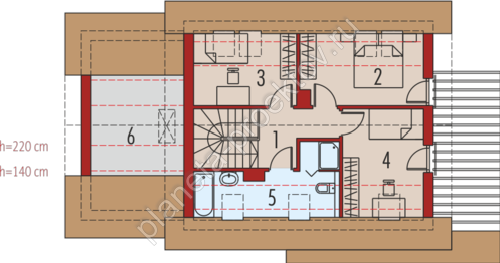 Компактность проекта дома позволяет разместить его на ограниченном в размерах участке. Основное пространство первого яруса занято гостевой зоной, состоящую из гостиной, совмещенной со столовой, и кухни. Небольшая комната может быть обустроена под кабинет. Завершает планировку санузел. Мансарда занята тремя комнатами и ванной. Благодаря мансардным окнам в помещениях всегда будет комфортно.