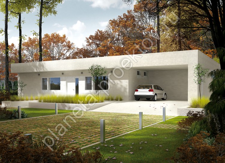 Что касается планировки, то весь этаж представляет собой разделенное на три зоны пространство. Акцент делается на просторной гостиной, в которой располагается столовая. Примыкает к ней кухня. Вторая половина дома отведена под три комнаты-спальни, между ними оборудуются санузел и ванная комната. Декоративным элементом может считаться комната, которая запланирована как балкон, выходящий на террасу из гостиной. Гараж встроен в общее жилое строение, при этом он возведен под кровлю, но открыт. Данные проекты домов наверняка понравятся любителям нестандартного жилья.
