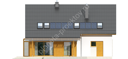 Современные и элегантные готовые проекты коттеджей в европейском стиле удачно впишутся в любой ландшафтный дизайн. Гармоничное сочетание панелей из дерева и оштукатуренных поверхностей способствует тому, что коттедж имеет привлекательный внешний вид. Украшение и грамотным функциональным решением является установка большого количества окон по всему периметру строения. Входная группа представляет собой раздвижные двери, ведущие с террасы-галереи в гостиную. При этом входной блок оформлен под навес с колоннами, что создает впечатление его цельности и завершенности.