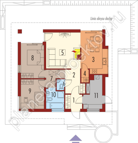 Объемно-планировочное решение отличается простотой и логичностью. Особенность оформления фасада заключается в том, что три двери из помещений выходят на галерею. Гостиная и столовая, совмещенная с кухней, отделены камином, при этом каждая из этих комнат выходит на террасу. Небольшой холл делит остальное пространство на две спальни, санузел и ванную. Из технического помещения можно выйти во двор.
