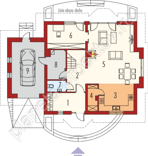 Вход в дом предваряет небольшая галерея, при этом выходят на нее и гостиная, и кабинет. Гостиная, совмещенная с кухней и столовой, выполнена как единое пространство, при этом обеденная зона удачно располагается в эркере. Дополняют планировку санузел и техническое помещение, которое выходит в гараж. Мансарда состоит из трех спален и двух ванных, при этом две комнаты выходят на балкон оригинальной формы. При этом сам выход на балкон оформлен в виде люкарны, которая встроена в скат кровли.