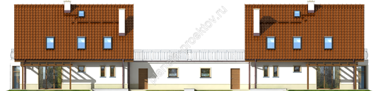 Данный проект предполагает возведение однотипных домов-соседей, которые будут иметь общую стену гаражей. С внутренней стороны коттеджа оформлена терраса, над которой сделан деревянный навес: летом его можно покрыть тентом и создать тем самым крытую веранду. Во внутренней планировке все предельно четко: первый этаж – гостевая зона, мансарда – зона отдыха. На обоих этажах будут оборудованы санузлы, а в мансарде дополнительно будет установлена ванная комната.