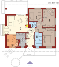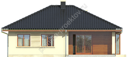 Украшением и одновременно грамотным функциональным решением является колонна, украшающая террасу. Поскольку площадь коттеджа довольно небольшая, в нем нет места коридорам и свободным пространствам. Традиционно основной акцент делается на гостиной, которая представляет единое пространство с кухней и столовой, расположенной в эркере. Завершают планировку три спальни, санузел и ванная комната.