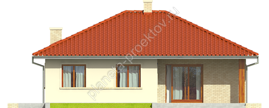 Небольшое одноэтажное строение с четырехскатной кровлей будет удачно смотреться в рамках даже ограниченного в размерах участка. Его современный внешний облик формируется за счет целого ряда деталей. Во-первых, в оформлении фасада идеально сочетаются оштукатуренные поверхности, деревянные панели и кирпичная кладка, которой облицовывается стена террасы. Во-вторых, полноценная инсоляция достигается за счет многочисленных окон и дверей со стеклом. В-третьих, гармонично смотрятся колонна на галерее, створки на окнах и слуховое окно круглой формы на фасаде.
