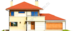 Пристроенный к дому гараж имеет четырехскатную кровлю. С лицевой стороны гаража располагается крытая галерея-терраса. Украшением коттеджа являются колонны, между которыми располагаются широкие окна и две пары двустворчатых дверей. В планировке первого яруса главную роль играет просторная гостиная, в ней оборудуется камин, и располагается столовая. Из этой же комнаты можно выйти в небольшую кухню. Санузел и техпомещение, ведущее в гараж, завершают планировку первого этажа. Мансарда состоит из трех комнат и ванной.