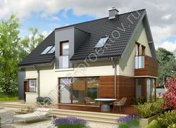 Проекты коттеджей из кирпича в современном стиле имеют традиционный и одновременно оригинальный дизайн, который складывается из важных функциональных деталей. Особую изысканность коттеджу придает прямоугольная люкарна, встроенная в скат кровли. Отделанная темной штукатуркой, она смотрится гармонично с общим обликом здания, выполненным в светлых тонах. Основная конструкция традиционно с двускатной крышей, а пристроенный гараж выполнен в современном стиле и представляет собой прямоугольник с плоской кровлей, благодаря чему сверху гараж обустроен как балкон.