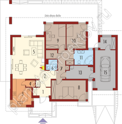 Объемно-планировочная организация отличается нестандартностью, поскольку четких зон в ней нет. Основная часть единственного этажа занята вытянутой гостиной, в которой располагаются кухня и столовая. Остальную часть занимают три спальни, санузел и ванная, а также подсобка, ведущая в гараж.
