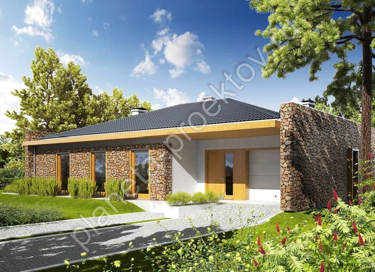 Объемно-планировочное решение одноэтажного строения характеризуется простотой и четким зонированием помещений. Все помещения разделяются длинным холлом на две части: гостевую и приватного характера. Г-образная гостиная с раздвижными дверями создает широкие возможности для удачного размещения в ней и столовой, и непосредственно зоны для приема гостей. Кухня соединяется с гостиной открытым входом. Завершают планировку санузел, ванная, небольшой кабинет и техпомещение, ведущее в гараж.