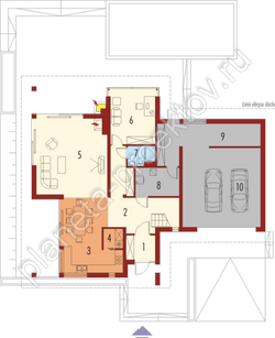 Объемно-планировочное решение предполагает возведение длинной прямоугольной гостиной, которая переходит в объединенное пространство из кухни и столовой. Просторы первого этажа позволяют обустроить на нем кабинет, дополняют планировку санузел и техпомещение, которое выходит в гараж. На втором этаже обустроены четыре комнаты, и оборудованы две ванные.