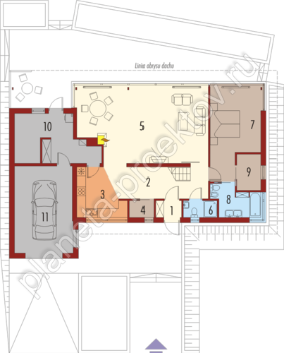 В данном проекте оригинально выглядит сочетание вагонки и кирпича в отделке, а также наличие прямоугольной люкарны, которая встраивается в скат кровли. На первом этаже расположена гостевая зона, где главной комнатой является гостиная. В ней же обустраивается столовая, а кухня вынесена за пределы этого пространства. Все помещения концентрируются вокруг узкого холла, при этом просторов первого яруса достаточно для того, чтобы разместить здесь спальню, два санузла и техпомещение, ведущее в гараж. Три комнаты и ванная образуют мансарду, украшениями которой выступают многочисленные мансардные окна.