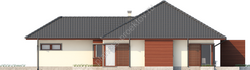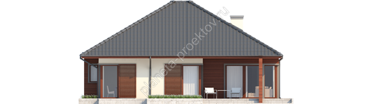 Небольшой, но вместительный и уютный одноэтажный кирпичный дом, выполненный в скандинавском стиле, будет гармонично смотреться на загородном участке любого ландшафта. Контрастная цветовая гамма – светлая штукатурка и отделка деревом темного оттенка – придает дому выразительность и привлекательность. Благодаря четырехскатной крыше строение выглядит приземистым, что способствует максимальной близости его к природе. Перед домом располагается галерея-терраса, также отделанная темным деревом и выглядящая эффектно и добротно.