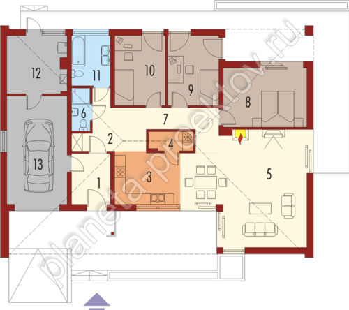 Площадь застройки: 182.78 м2 Строительный объем: 496.57 м3 Ширина: 17 м Глубина: 13 м Высота: 6.02 м Мин. размеры участка: 25.4x22.9 м Площадь кровли: 219.3 м2 Уклон кровли: 20 ° Гараж: 1 Мансарда: нет Цокольный этаж: нет