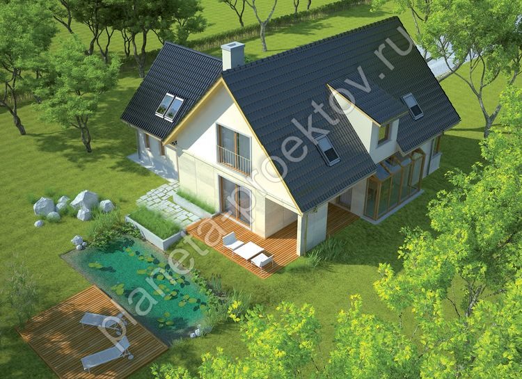 Первый этаж представляет собой стандартный набор помещений, включающий в себя гостиную, кухню и столовую – эти три комнаты образуют единое пространство. Столовая расположена в остекленном эркере, а украшением гостиной является камин. Кроме этих комнат на первом ярусе будет обустроено отдельное помещение – кабинет или библиотека, в котором можно проводить переговоры. Оформление мансарды производится в традиционном стиле: три изолированные комнаты образуют спальни, а примыкает к ним ванная.