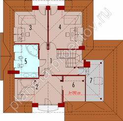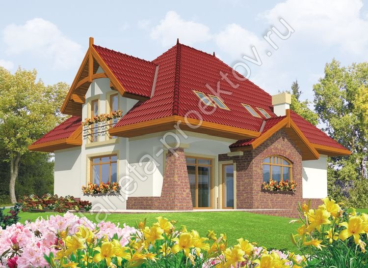 Интересна и внешняя отделка фасада: светлая штукатурка идеально гармонирует с облицовкой кирпичом. Планировка отличается грамотной выстроенностью и функциональностью, да и площадь жилого объекта позволяет создать уютное жилье. Гостиная создает единое пространство с кухней, при этом выйти на террасу можно из столовой (она располагается в гостиной) и из кухни. Кабинет, санузел и техническое помещение завершают планировку. В мансарде будут обустроены три спальни, завершит планировочное решение оборудованная здесь ванная комната.