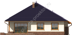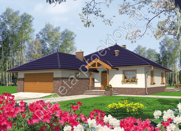 Лаконичный и компактный с виду кирпичный дом в стиле кантри довольно вместителен и комфортабелен для проживания. При этом все жилые и бытовые комнаты располагаются на единственном этаже. Стиль кантри – это сочетание различных архитектурных направлений, которые объединяются в одном здании. Украшением данного дома является удачно подобранная цветовая гамма: кровля покрыта черепицей чернильного цвета, что гармонично смотрится со светлой штукатуркой стен и кирпичной облицовкой фасадов. Вход в дом оформлен под небольшую самостоятельную кровлю. С внутренней стороны коттеджа располагается галерея-терраса, на которую ведет остекленная двустворчатая дверь из гостиной.