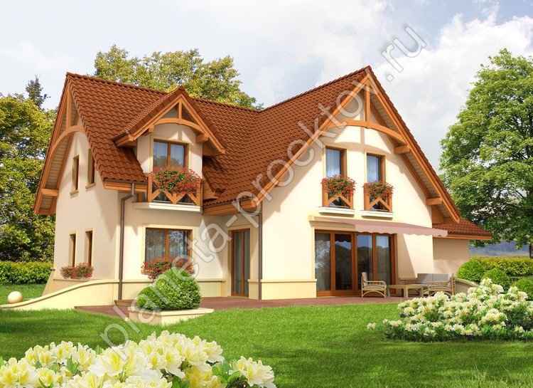 Особенность стиля кантри – стремление к стилизации деревенского стиля в оформлении экстерьера дома. Выражается это в наличии декоративных элементов и одновременно в стремлении создать функциональный и удобный коттедж в стиле кантри из кирпича. Однако самое главное, что привлекает в этом доме, - это лиричность и романтичность внешнего облика, который нельзя не заметить. Эркеры и люкарны служат главными выразительными элементами в этом коттедже. Гармоничное цветовое сочетание изящно подчеркивается выступающими балками и черепицей красного оттенка.