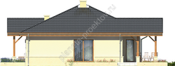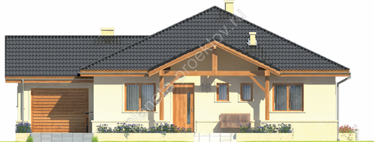 Прямоугольная форма гостиной позволяет удачно разграничить зону отдыха от зоны бытовой. Кухня оформлена в самостоятельное помещение, а обеденная зона по плану будет размещена в гостиной. К помещениям личного пользования относятся три спальни. Санузел и ванная завершают планировку единственного этажа. Небольшое техническое помещение ведет в гараж.