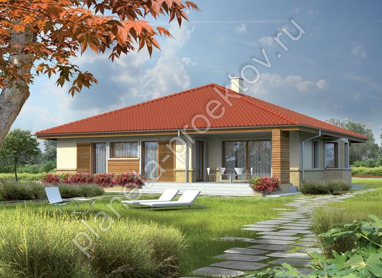 Пространственно-планировочное решение строится на основе того, что схема строения состоит из одного этажа. Гостиная с эркером является основным помещением, которое соединено с кухней. В эркере достаточно места для расположения обеденной зоны, а украшением всего этого единого пространства является камин. Три спальни образуют зону личного пользования, а санузел, ванная и техпомещение служат бытовыми помещениями.