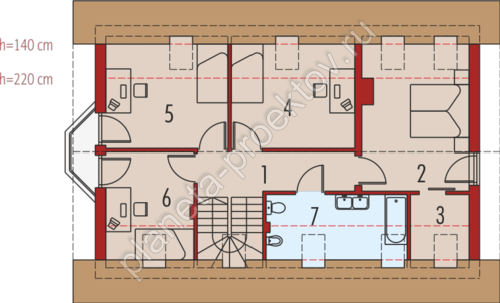 Объемно-планировочное решение строится на основе того, что в коттедже по схеме будут возведены два этажа. Именно поэтому на первом этаже обустраивается удобная гостевая зона. Ее особенность – в нестандартности формы, а потому единое пространство из гостиной, столовой и кухни оказывается грамотно распределенным. На этом же ярусе планируется обустройство санузла и техпомещения, связанного с гаражом. Четыре комнаты образуют зону отдыха в мансарде, а завершающим штрихом в планировке является оборудование ванной.