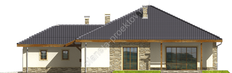 Важными функциональными и одновременно декоративными элементами, украшающими террасу, являются кирпичная и деревянная колонны. Что касается плана расположения комнат, для него характерна необычность. Главная комната единственного этажа – это гостиная квадратной формы, двери которой выходят на внутренний двор. Обеденная зона и кухня оформлена в отдельное помещение. Зону отдыха образуют три спальни, а к бытовым помещениям относятся санузел и ванная. Техническое помещение связывает дом с гаражом.