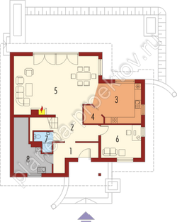 Организация внутренних помещений происходит с учетом принципов практичности и рациональности. Г-образная гостевая зона позволяет четко разграничить зону для приема гостей от бытовой, состоящей из кухни и обеденной зоны. На площади этажа достаточно места для обустройства кабинета и санузла. Просторные холлы могут использоваться для разного назначения. Три спальни в мансарде гармонично дополняются небольшой комнатой отдыха, а также ванной.