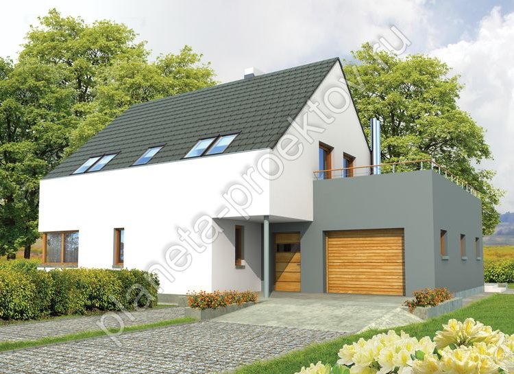 Неброский дом в современном стиле, построенный из кирпича, выглядит стильно и своеобразно. Сочетание светлой и темной штукатурки делает внешний облик строения контрастным и привлекательным. Традиционная двускатная крыша, которая покрывает само здание, выразительно смотрится с гаражом под плоской кровлей. Панорамные окна не только придают дому яркость, но и способствует естественной инсоляции. Из гостиной можно выйти на террасу. Сочетание эркера с балконом с простотой внешнего оформления делает коттедж эффектным.