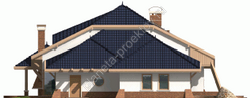 Планировка коттеджа характеризуется простотой и лаконичностью. Гостиная трапециевидной конструкции является основой первого яруса. Она отличается наличием панорамных окон и камина. Колонны разделяют гостиную и кухню с барной стойкой. Небольшой кабинет и спальня относятся к помещениям личного пользования на этаже, а из бытовых комнат здесь будут оборудованы ванная и санузел. Техническое помещение связывает жилое строение с гаражом. В мансарде запланировано пространство под две спальни. Угловая ванная завершает планировку всего коттеджа.
