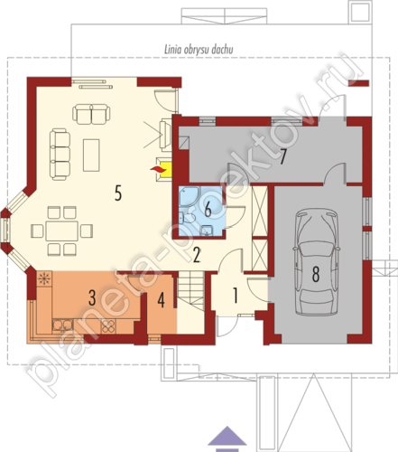 Объемно-планировочное решение рационально и практично. Акцент делается на большой гостиной, которая соединяется с кухней. Пространство между ними занимает обеденная зона, расположенная в эркере. Из бытовых помещений на ярусе будет оборудован санузел. В гараж можно выйти прямо из холла. Мансарда предназначена под обустройство зоны отдыха, где запланированы четыре спальни и ванная комната.