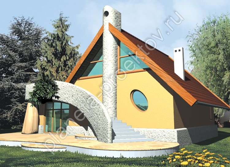 Весьма необычное для дома решение. Даже очень необычное. Не совсем понятна функциональная роль вот этой колонны-не колонны, даже не знаю, как ее назвать. Но она, конечно, фасад украшает. Вообще проект оригинальный, дом получился совсем нетрадиционным, напоминает шале, альпийские домики гномиков.