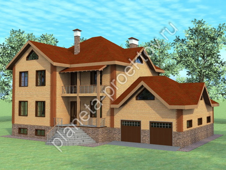 Привлекательный внешне особняк, выполненный по проекту загородного дома из кирпича, станет украшением любого приусадебного участка. Внешний вид строения при всей лаконичности выглядит аккуратным и сдержанным за счет того, что все элементы фасада расположены симметрично. Выделяет коттедж оформленный отдельной пристройкой флигель, в котором предполагается обустройство двух гаражей.