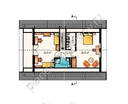 Представленная разработка Баба-Яга АР-41 отличается компактностью и функциональностью. Внешний облик довольно прост и лаконичен, но при этом привлекателен. В пределах одного этажа проектировщики умело разместили следующие помещения: тамбур, топочную, кухню, столовую, гостиную, гардеробную и две спальни. Все комнаты объединяет узкий протяженный коридор, который таким образом организует всё жилое пространство. Также по проекту дома из гостиной и одной спальни предусмотрены выходы на открытую террасу перед домом. В теплое время можно организовать здесь летнюю кухню, детскую площадку или зону отдыха.
